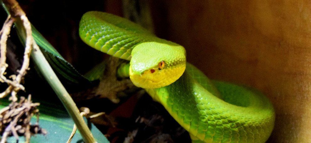 "Man muss im Umgang mit ihnen Haken und Zangen verwenden", erzählt der Experte. Außerdem sind ihre Terrarien abgeschlossen und aus speziellem Sicherheitsglas. Weniger gefährlich sind die Pythons gegenüber, auch wenn sie bedrohlich zischen, als Graf die Terrariumscheibe zur Seite schiebt. Die größte wiegt 70 Kilogramm und hat seit dem Besuch einer Kindergartengruppe den Spitznamen dicke Berta, erzählt Graf. Er habe den Tieren nie Namen gegeben, dafür seien es einfach zu viele. In manchen Terrarien muss man erst eine Weile suchen, bis man ihre Bewohner entdeckt. Sie sind in der naturgetreuen Einrichtung gut getarnt und bewegen sich nicht viel, sagt Graf. Für Action und bunte Hingucker sorgen deshalb in einigen Schaukästen auch kleine Vögel.