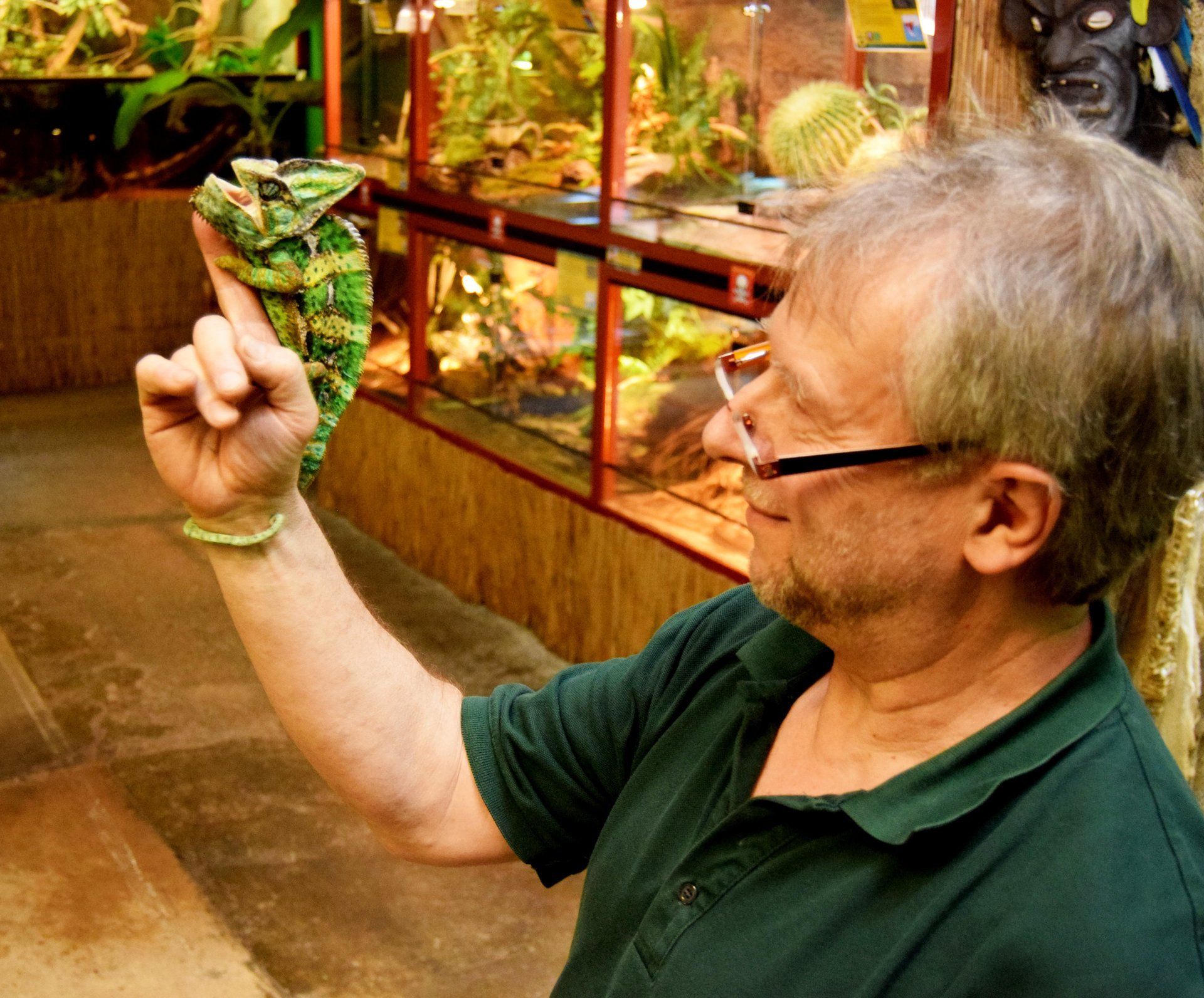 An Tagen, an denen wenig los ist, lässt Graf auch eine seiner Wasseragamen gerne frei im Zoo herumlaufen. Sie ist ebenfalls an Menschen gewöhnt, erzählt er. Und an den Wochenenden sitzt ein Papagei im Eingangsbereich und begrüßt die Besucher.